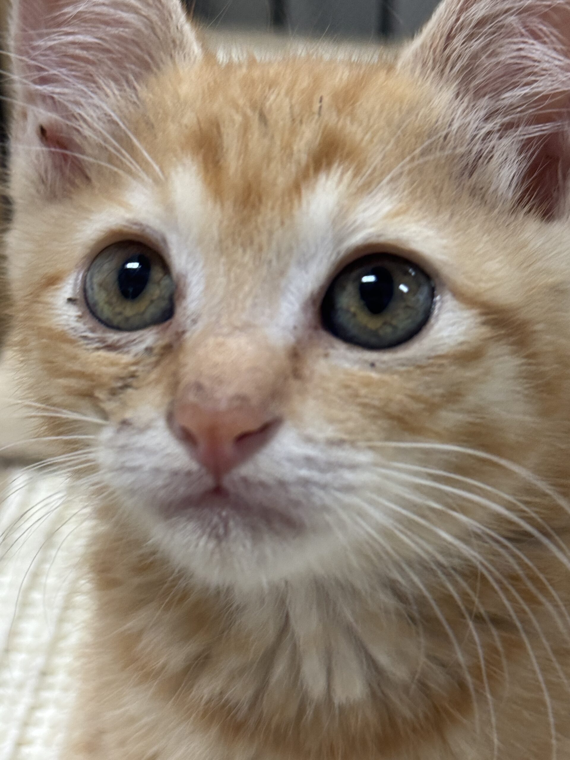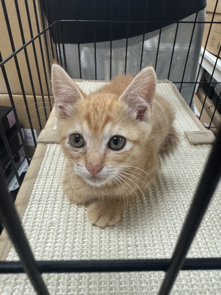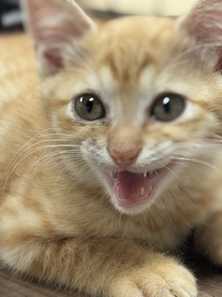 生後1か月くらいの猫でした。休み中に倉庫近くで猫が鳴いていると社長がおっしゃるので行ってみると確かに猫の声がします。どこか2人で探しているとブルーシートの中にいるではありませんか。しかも本当に小さい。ずっと鳴いている。